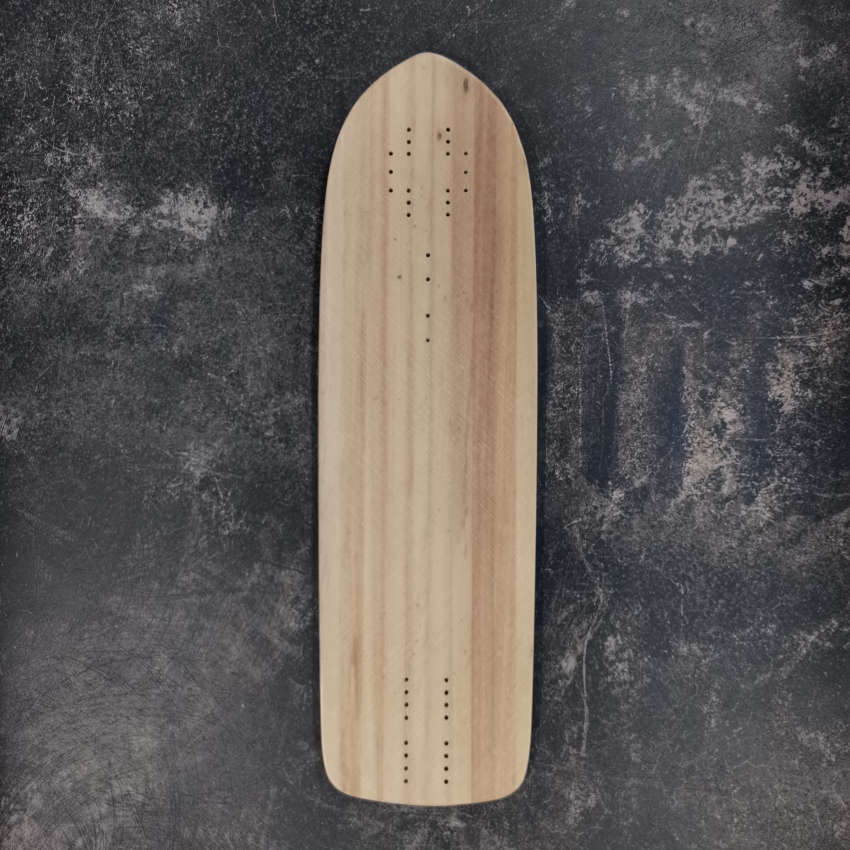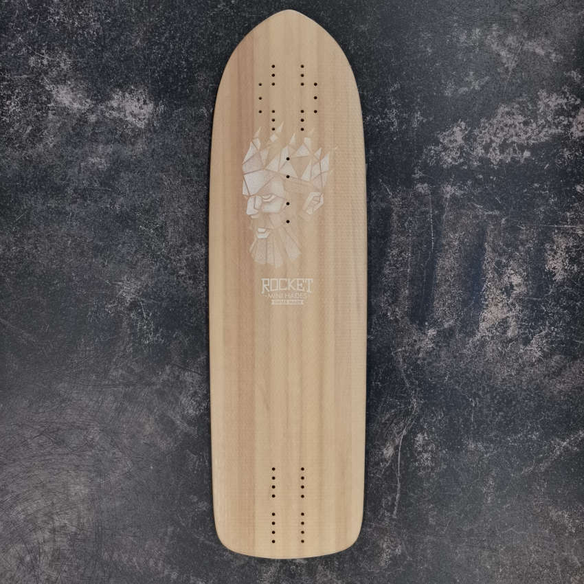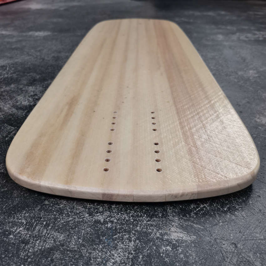 The board has neither wheel wells, flush cuts, nor urethane edges. It is therefore less impact-resistant than the final version with urethane edges.