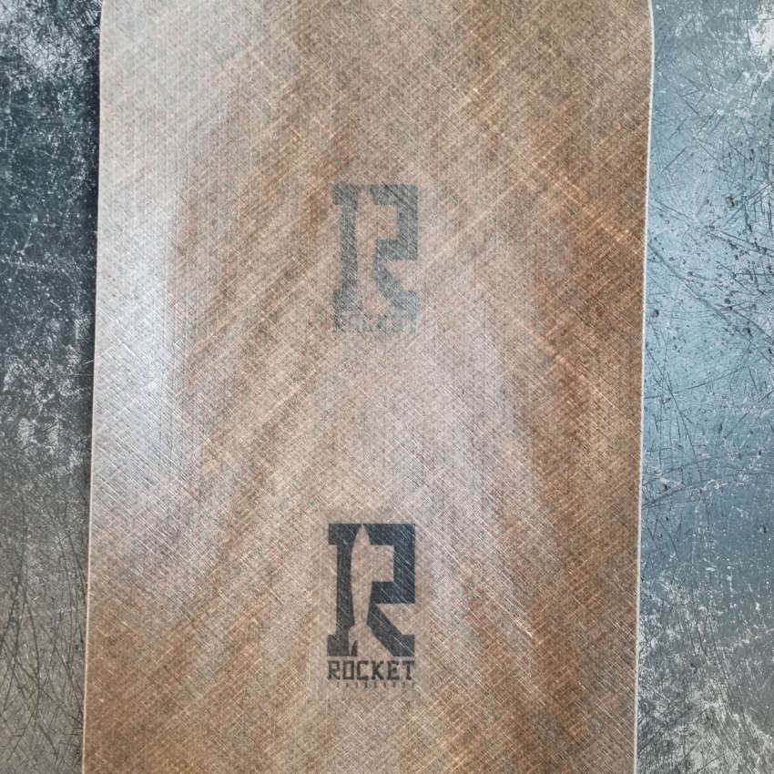 The top flax layer has two logo tests on it. This board was ultimately never mounted or ridden.